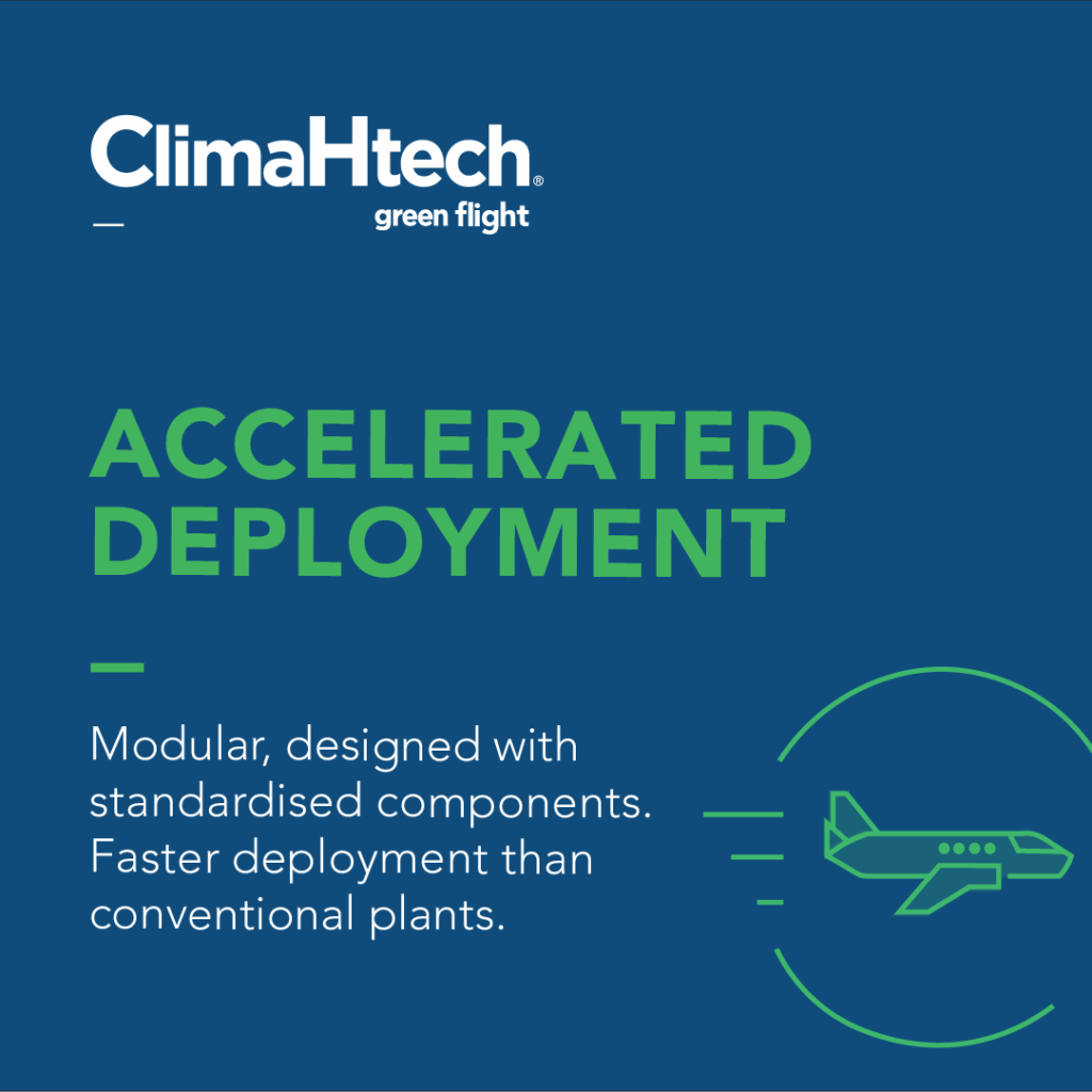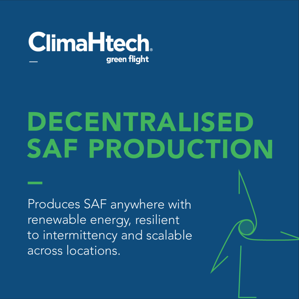 ClimaHtech Green Flight offers SAF production (e-SAF and Bio-SAF) via renewable electricity and sustainable biomass in a modular, decentralised, and scalable system.